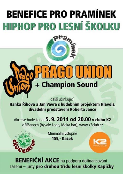 2. Pátek 5.9., Říčany, K2, Benefice pro Pramínek – hiphop pro lesní školku, PRAGO UNION + Champion Sound